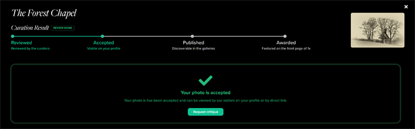 Images approved by member curators will now be given the status Accepted. These images will appear on the photographer’s profile page but not in the main front-page gallery.