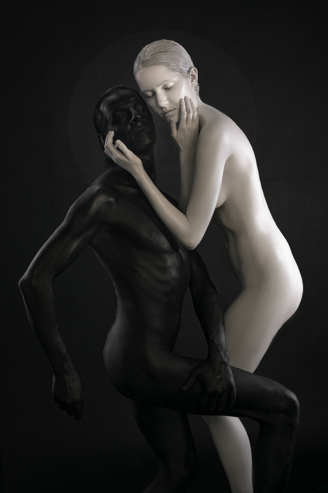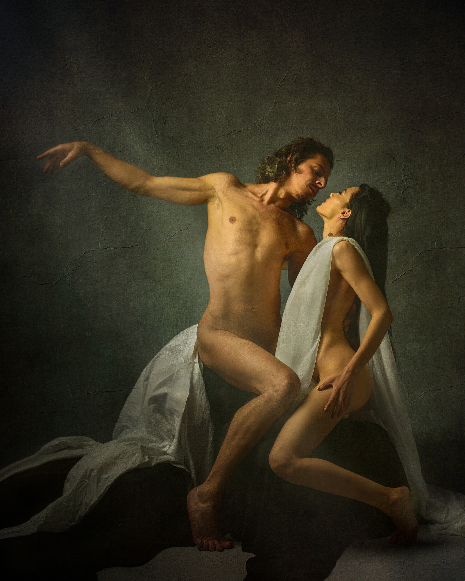 Pietà is dear to me. I wanted to re-engage a sacred archetype through contemporary portraiture—grief as a universal, not historical, condition. We built it with real drapery, restrained palette, and meticulous hands placement. The light is feathered from above-left, with negative fill to keep the values solemn. There’s a quiet halo suggested by separation, not a graphic line. On set, we let silence do the directing. What moved me most was the tenderness between the models when the camera wasn’t clicking—that “between gestures” truth.